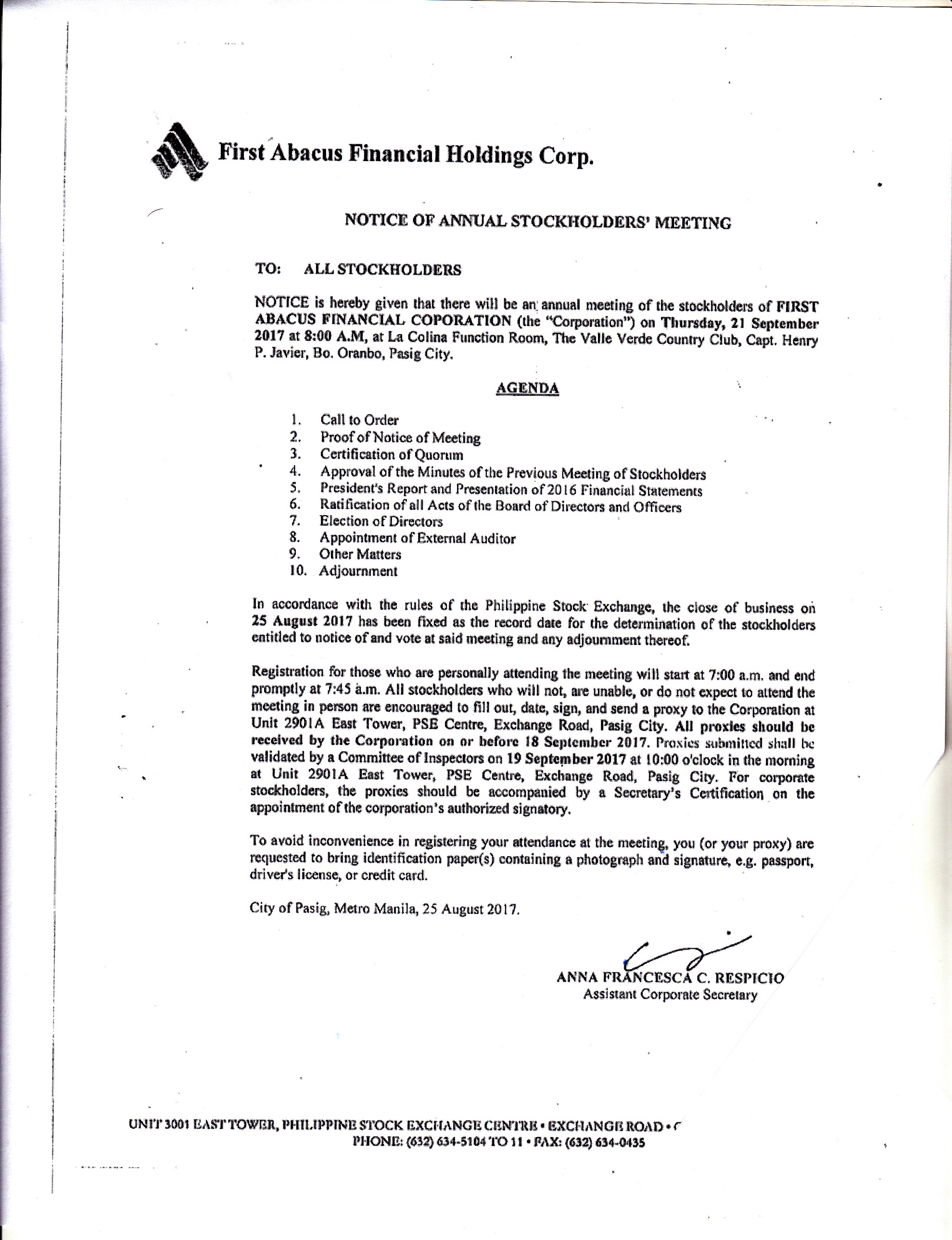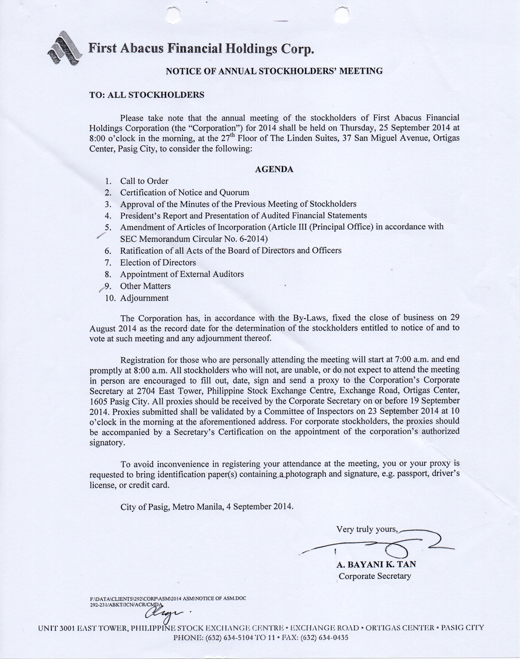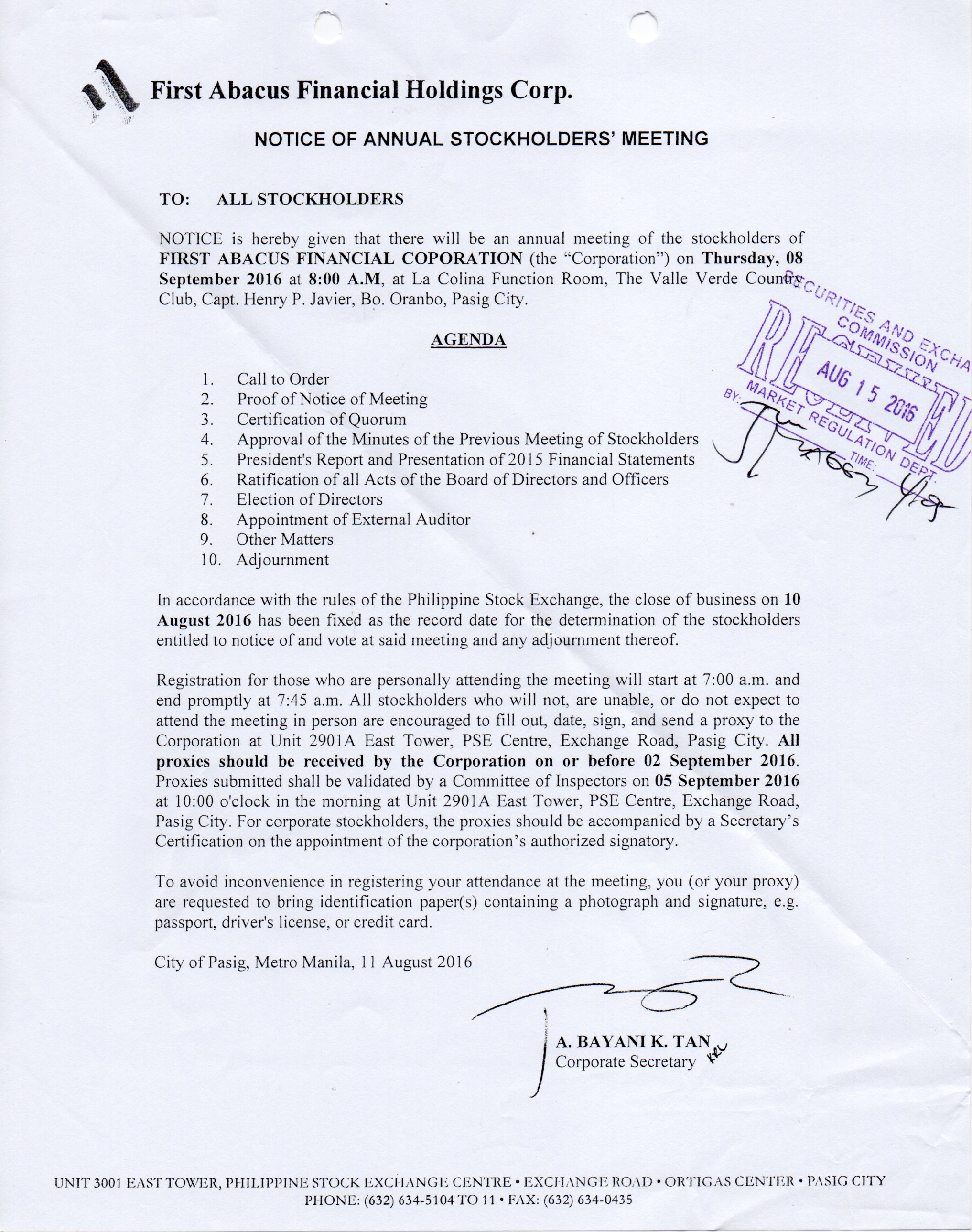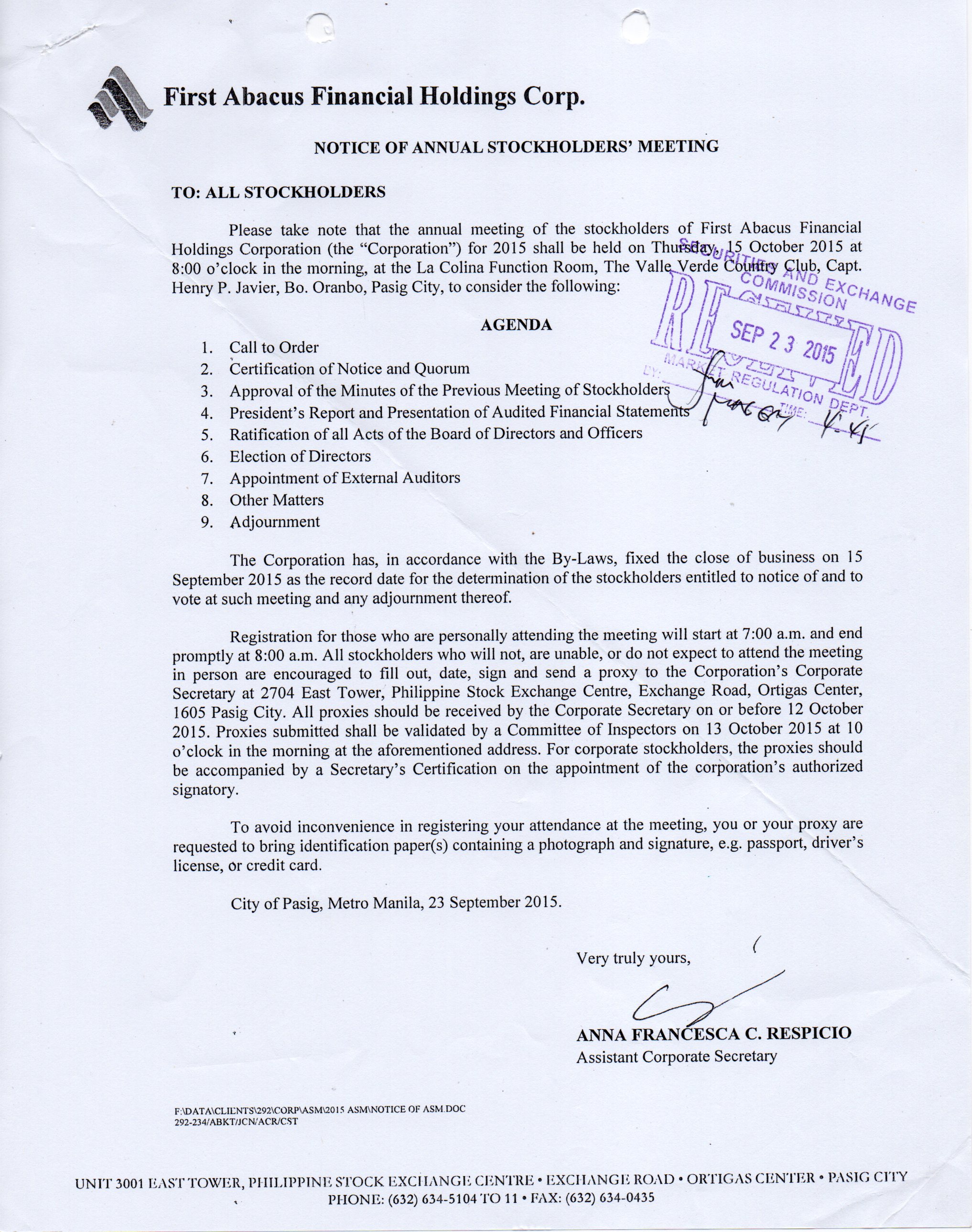 | Oct, 15, 2015 | Notice | Notice Of Annual Stockholders Meeting | Stockholders Meeting | |